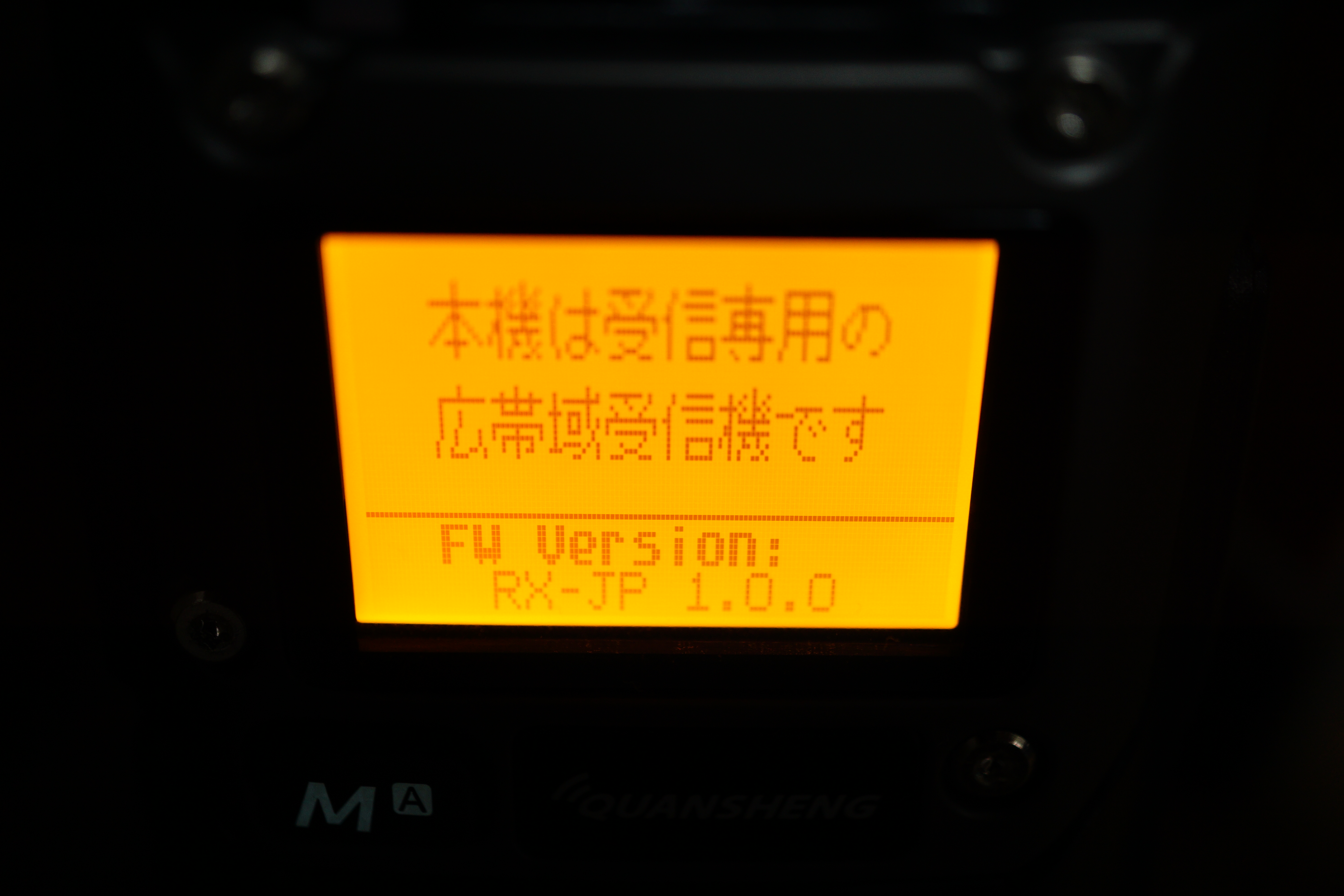 聞くところによると輸入・保有は合法ですが電源を入れただけで(送信ボタンを押さなくても)違法らしいです。ですので初期不良の確認もせず、いきなり「メンテナンスモード」で起動しファームアップしました。